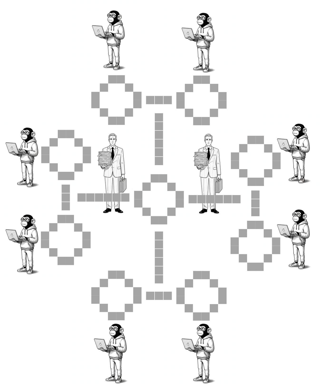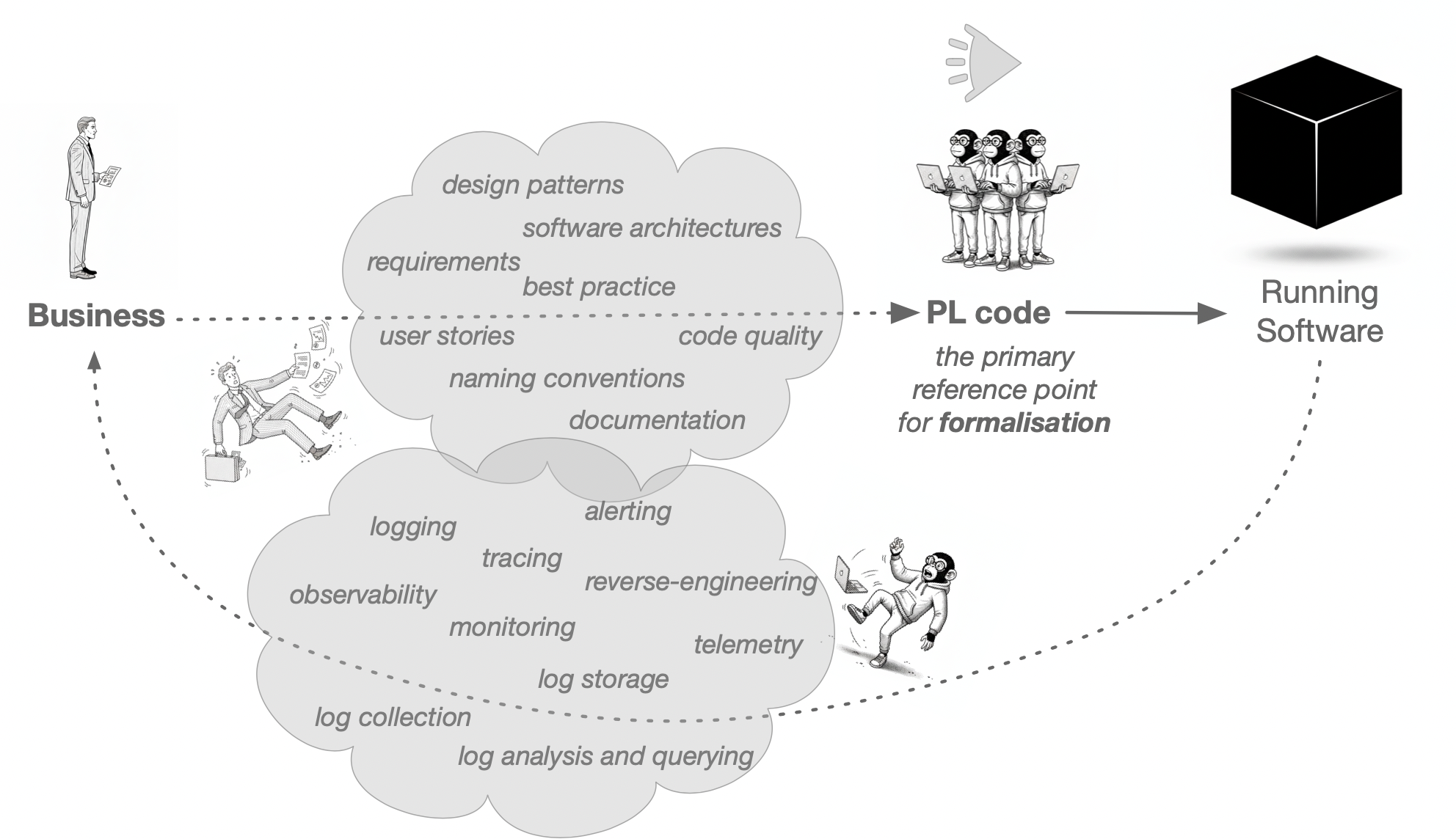 All executable artefacts exist only on the technical floor; the business floor has no direct access to it and only exerts an informal, indirect influence via “requirements” submitted to the technical floor. The actual correspondence between the two floors does not exist in any formalized form—it exists only in people’s heads and is therefore not enforceable.