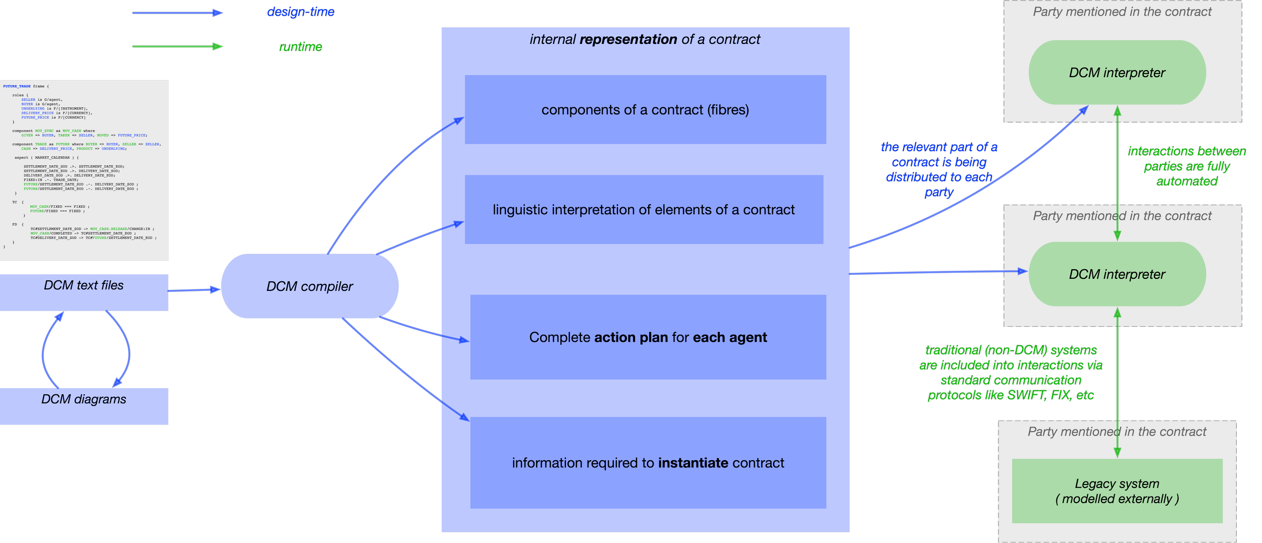2. Feed these artifacts into the DCM compiler, which performs extensive inference and generates an internal representation of the contract. This includes all information required to instantiate a new contract, as well as a complete action plan for each party involved—defining what each party must do to fulfill its role. This step succeeds only if the contract description is consistent and executable. If the description is incomplete or contains conflicting actions, it will fail to compile. In essence, this step allows DCM to “fill in the gaps” in the description, much like how the meaning of a sentence is constructed from just a few grammatical and lexical cues.