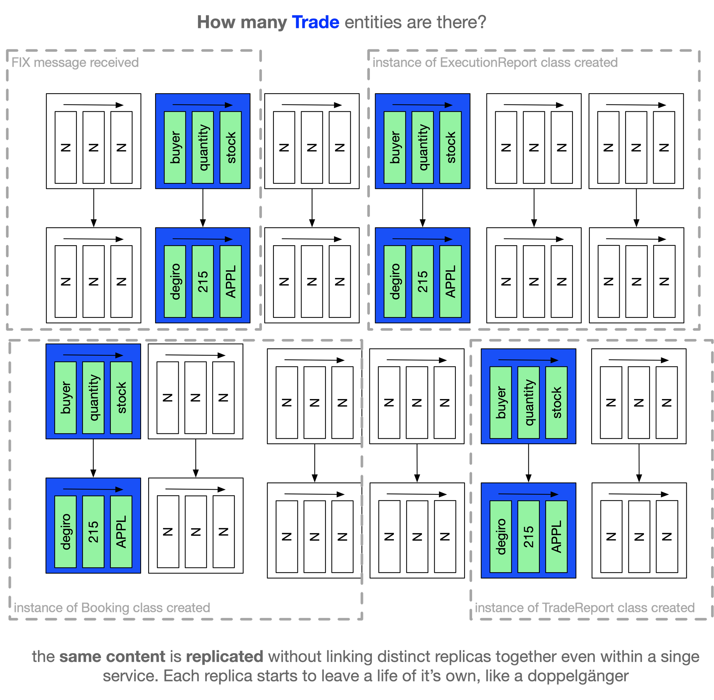 There is no built-in mechanism to link all of these particles as replicas of a single target-domain object (e.g., a trade). They are all decoupled. This is yet another instance of the Humpty-Dumpty problem discussed earlier.